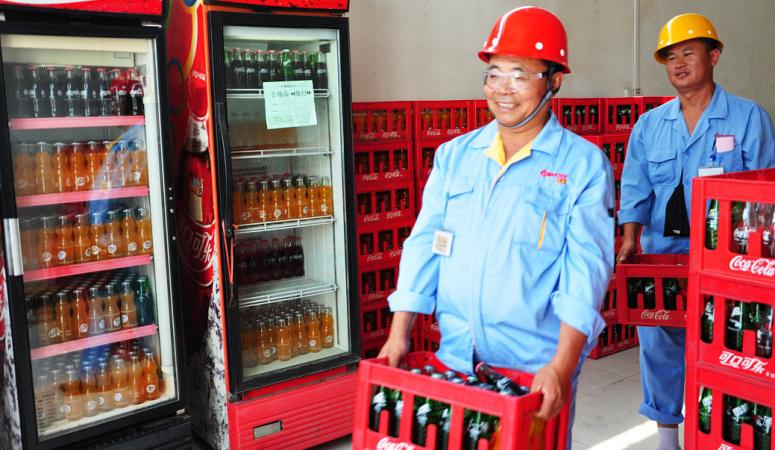 圖為生產員工工作間隙領取冰鎮(zhèn)汽水
